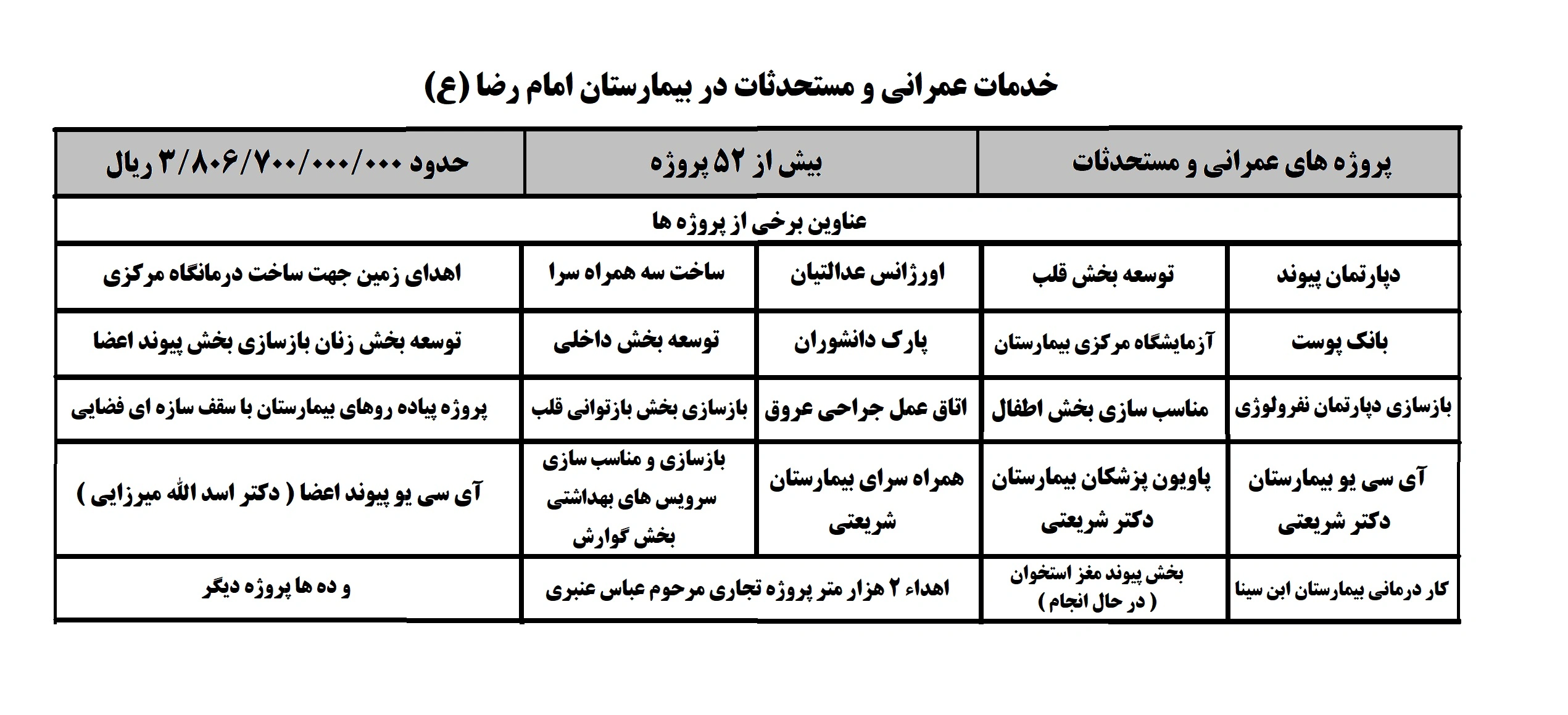 موسسه نیکوکاری میزبانان خورشید با همکاری خیرین، پروژههای عمرانی گستردهای در بیمارستان امام رضا (ع) اجرا کرده است که شامل بهسازی بخشهای مختلف بیمارستان، بهبود زیرساختها و تأمین تجهیزات پزشکی برای ارتقاء کیفیت درمان بیماران است. این اقدامات به ایجاد محیطی ایمنتر و راحتتر برای بیماران و کادر درمان کمک کرده و در جهت تقویت نظام درمانی کشور گام برداشته است.